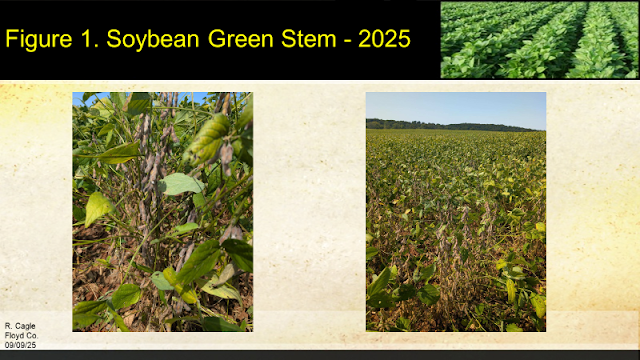 Late yesterday afternoon, I received a phone call from Floyd Co. Extension Agent, Keith Mickler, about green stem in soybean (Figure 1.) I can tell you from personal experience that green stem can cause major headaches when combining soybeans. In fact, it took 6 man hours to clean out my small-plot combine last year after it got stopped up with green stemmed beans! (knife, machete, long screwdriver, torch, lots of sweat equity)