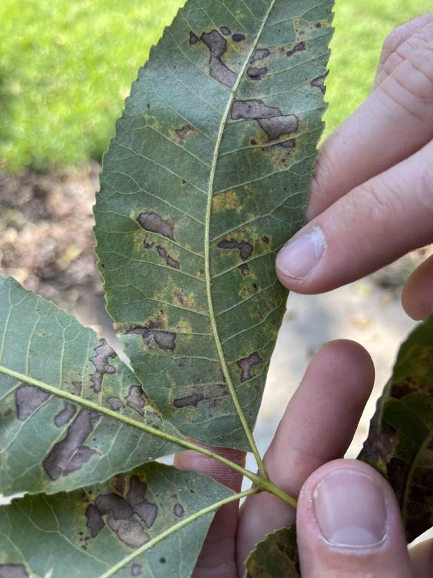 In my last pecan update I spoke about how we had not seen much aphid or mite pressure yet but to stay on the look out. The week after that post the aphids hit us hard in Appling County, especially on sumners. I have seen several spots of defoliated trees in the county due to Black Pecan Aphids (BPA). Where this occurred, after speaking with the producer, we learned that a pyrethroid was applied in the orchards shortly before the insect pressure increased. When we apply a pyrethroid in our orchards we are risking flaring aphids, therefore we should make certain the pyrethroid application is justifiable and that there is not a better treatment before we make that application. After making the pyrethroid application we should stay on the look out for BPA. The picture below shows an immature BPA, the next picture below shows defoliation due to BPA damage.