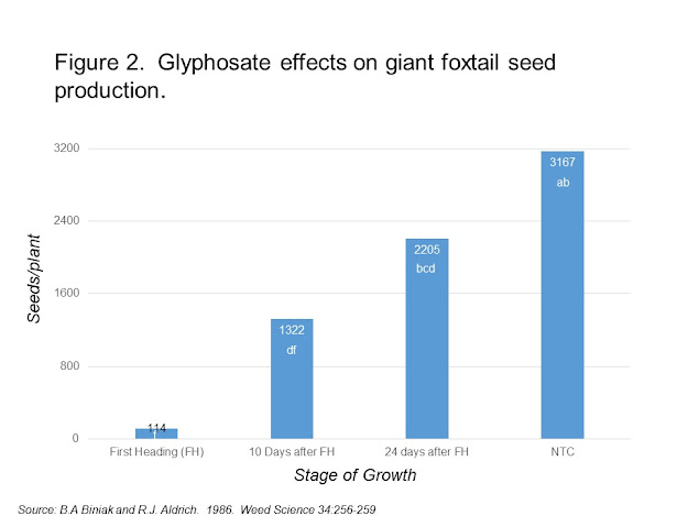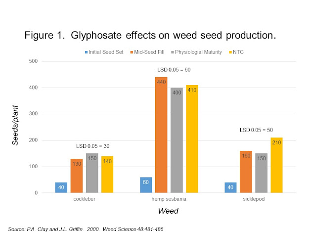 Check out Figures 1 & 2.  You will note that glyphosate applications only reduced weed seed production when applied early.  Generally, glyphosate applications made to plants with maturing seed were not as effective and would likely be a waste of time and money.