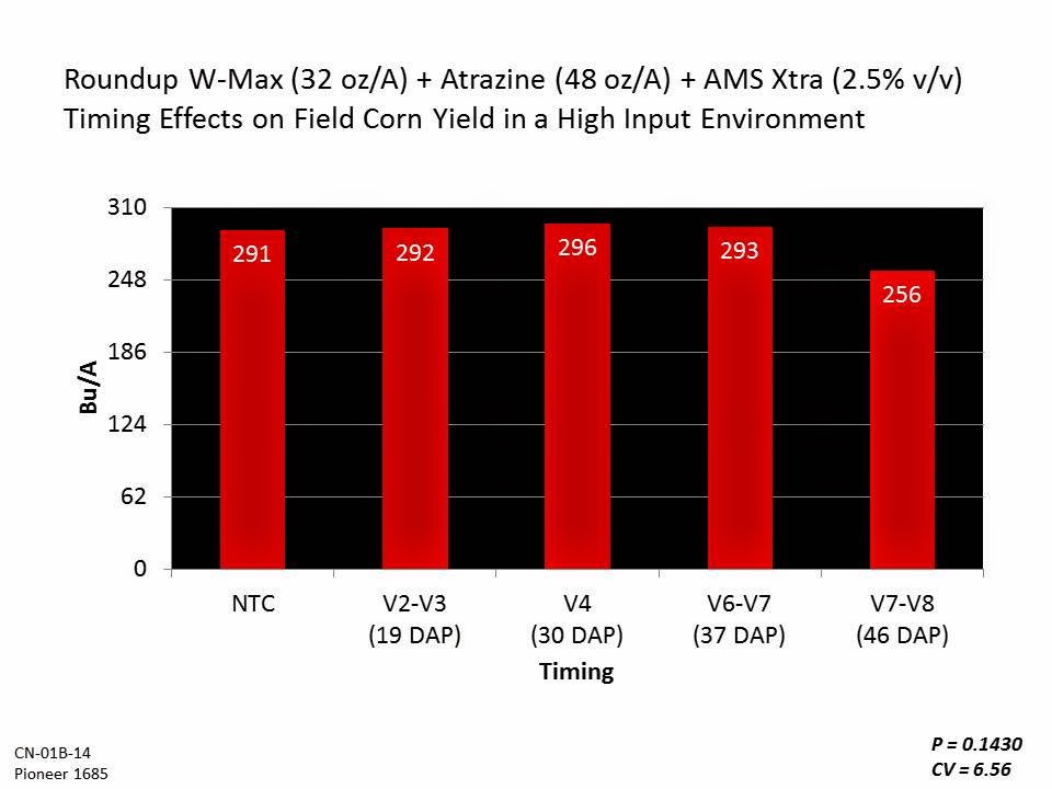 2) Results from 1 field trial conducted in 2014 in a high input environment with Roundup + Atrazine would suggest that there might be some yield problems if applied over-the-top after the V7 stage of growth (Figure 1). This research is being repeated in 2015. Growers with corn fields in the V7 stage or later should strongly consider using a lay-by rig with this treatment.