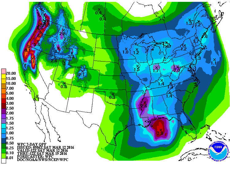 The 7-day QPF shows that the western portion of the Southeast should get the most rain in the next week. This will occur in two batches. The first event is a continuation of the rainy conditions that have plagued Louisiana, Arkansas and Mississippi this week in association with a cut-off low that is moving very slowly through the area. The second batch should come on Thursday and Friday as a new system approaches. In between weather should be dry. Looking down the road, rainy conditions are likely to continue for the next two weeks, but we expect a return to cooler temperatures (and perhaps well below normal temperatures) near the end of the 2-week period.