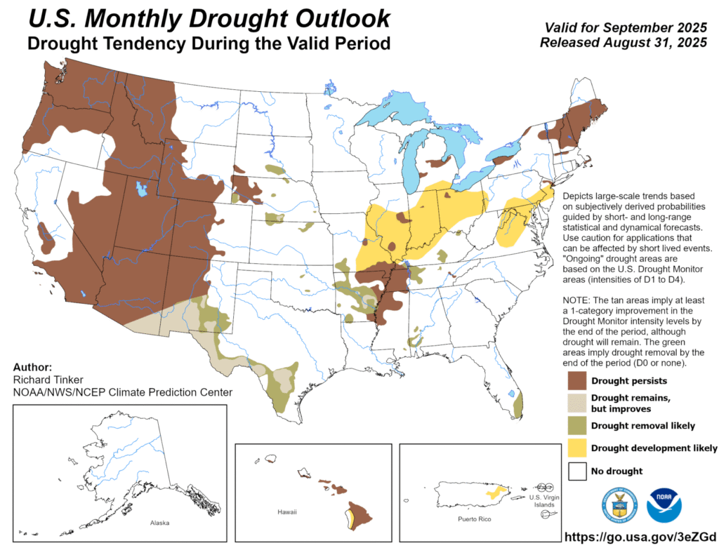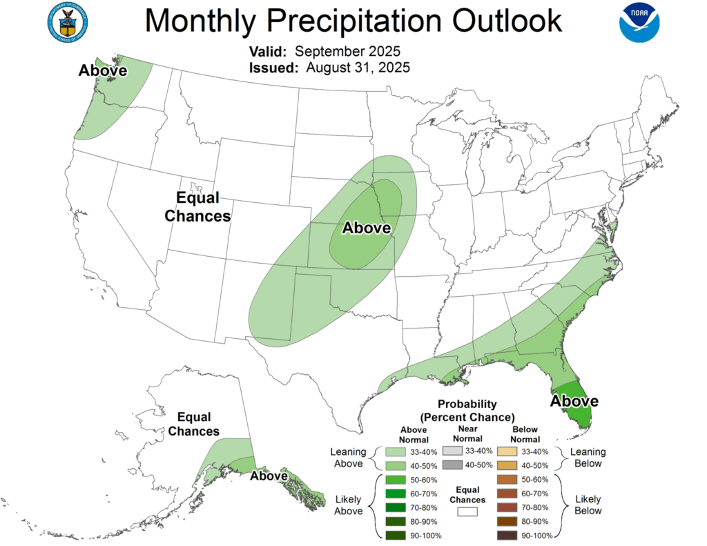 The latest monthly climate outlook for September 2025 was released today. It shows that the forecast for precipitation indicates a continued chance of wetter than normal conditions in Florida, which could lead to an end to the drought conditions that are currently there. There is no signal for what the temperatures will be over the month, with some periods of warm conditions and others of cold conditions possible. The drought outlook indicates that there is a chance of drought development in parts of Virginia in the next month due to continued lack of rain there.
