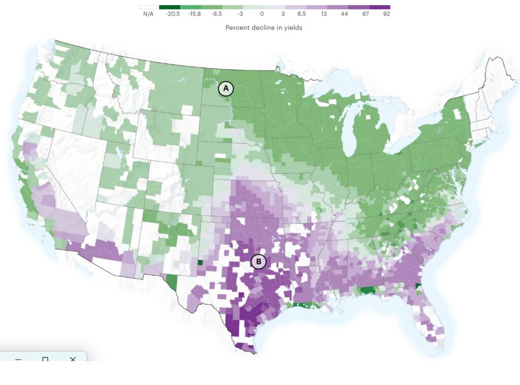 ProPublica published a series of maps describing how the climate of the US is likely to change by mid-century back in 2020. It popped up in my social media feeds this week so I thought it might be good to highlight it again. You can see the article at https://projects.propublica.org/climate-migration/. One of the most striking maps from an agricultural standpoint is the map below, which shows projected changes in yield for commodity crops across the country. This is for a moderate increase in emissions, which is very likely to occur, rather than the high emissions levels used by some of their maps (or they give you a choice). Areas in purple are expected to see significant decreases in yield by the 2040-2060 period based on the increased temperatures and humidity as well as increases in evaporation and reduction in available water. This area includes most of the coastal plain across the region where the biggest crop yield from commodity crops now occurs. The only places that are likely to see an increase in yield are higher elevations and more northerly locations, which will see warmer temperatures that lead to a longer growing season.