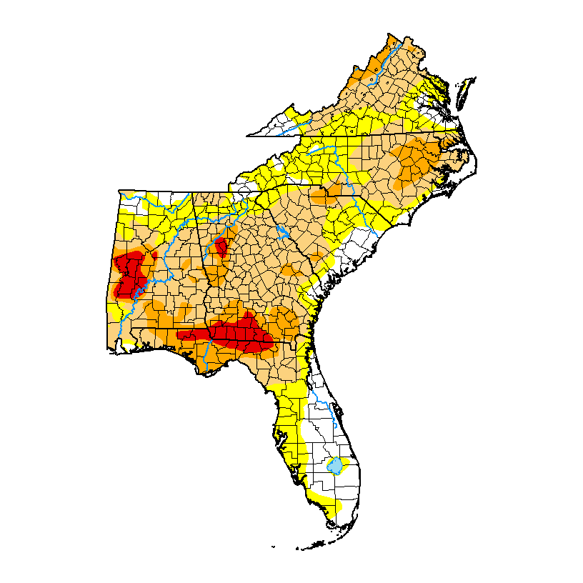 The latest Drought Monitor, released today, shows an expansion of extreme (D3) drought in southern Georgia and the Florida Panhandle and in western Alabama as well as the addition of a new area near Atlanta. Many other parts of the region also experienced worsening conditions due to the significantly lower than average rainfall this month so far (see other post today). The only area that improved was a small sliver of western Alabama which received some needed rain. Abnormally dry conditions also expanded slightly in Puerto Rico this week.