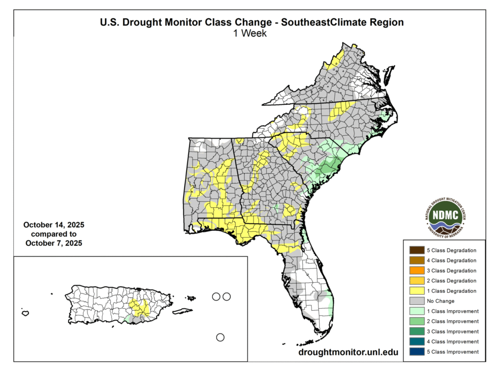 The latest Drought Monitor, released today, shows that drought expanded in most of the region this week due to warm temperatures and the nearly complete absence of rain. In west central Alabama and southwest Georgia, the areas of extreme (D3) drought nearly doubled and the extreme drought expanded into the Florida Panhandle, which is experiencing a similar lack of rain. Abnormally dry conditions also expanded in Puerto Rico.