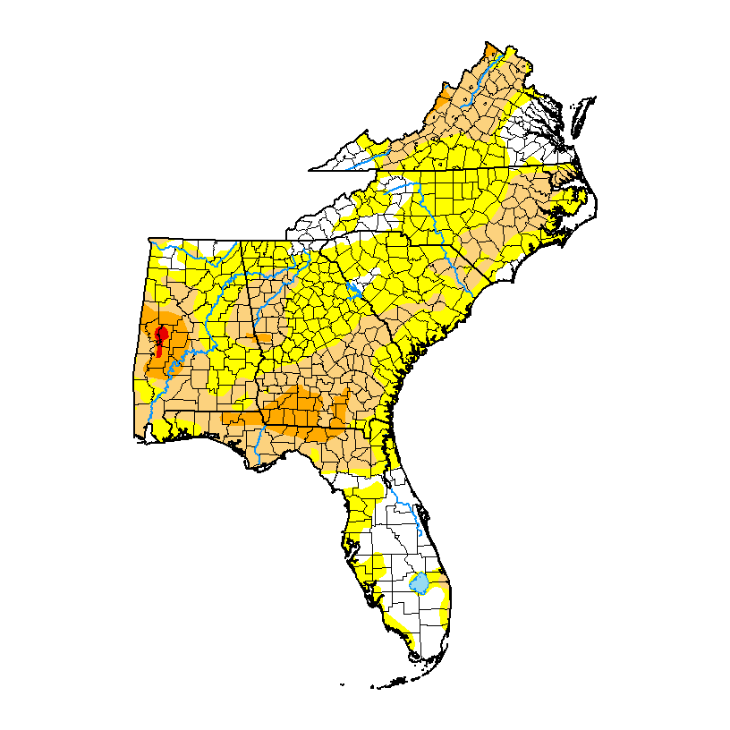 The latest Drought Monitor, released today, shows that drought has gotten worse in many parts of the region, including northern Florida, all of Alabama and Georgia, and the Carolinas. Drought conditions have been reduced in eastern Virginia and central Tennessee, which experienced more rain in the past week than other states. Southern Florida is also largely out of drought, and abnormally dry conditions have improved in Puerto Rico, due to tropical rainfall in the past week. The worst hit area is in west central Alabama, which now has a patch of extreme (D3) drought due to the lack of rain there over several weeks.