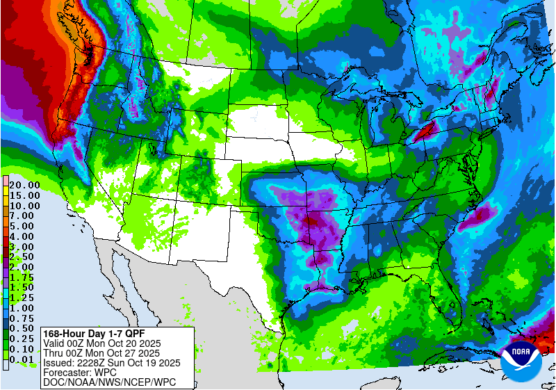The latest 7-day QPF map shows that most of the region will see little rain again this week after showers passed through today as a cold front approached the area. The remains of the front will bring rain to the Florida Peninsula early this week but the rest of the region will remain dry. By midweek, even Florida will be dry. The next chance of rain will occur late in the 7-day period, but amounts will be quite light again. The heaviest amounts will occur in northern AL and GA as the next front approaches the region.