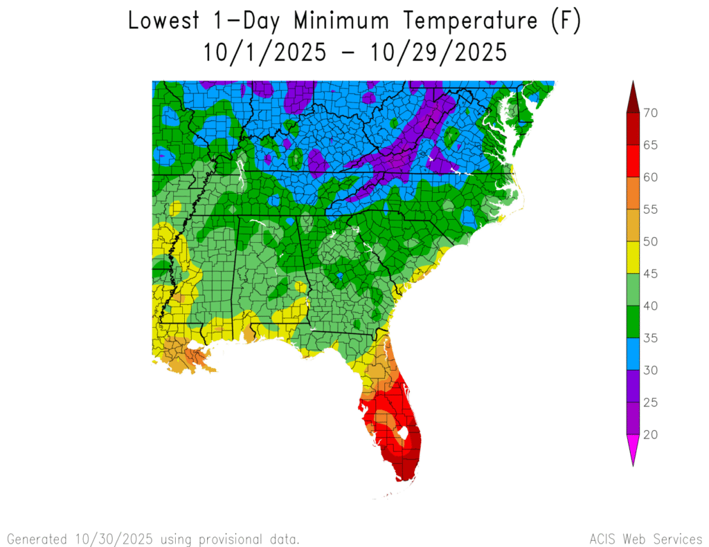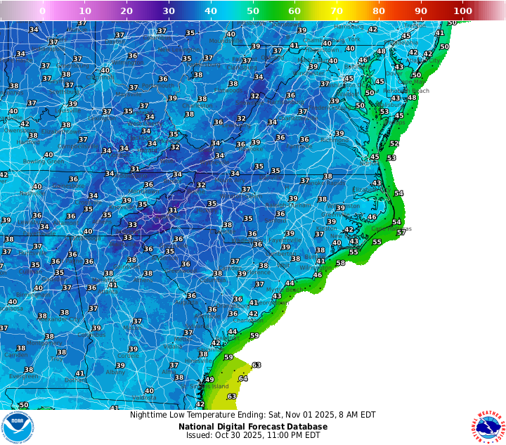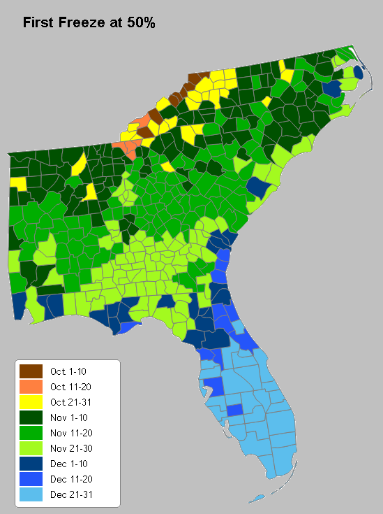With the passage of a cold front through the region on Wednesday, cooler and drier air has filtered into the region. Once the clouds move out, radiational cooling should drop the temperature in many places into the 30s, leading to the probability of frost. Most places will not get down to freezing except the higher elevations and some valleys where cold mountain air can drain, but some frost damage could occur to tender plants. Things should start to slowly warm up again after Saturday. The long range forecast currently indicates that a freeze is not likely in the northern part of the region until mid-November, but if you live in an area that is prone to cold temperatures, watch the forecasts carefully. So far, only higher elevations in Virginia and North Carolina have experienced freezing temperatures. The map from AgroClimate.org at the bottom shows the average date of the first fall freeze. You can see more maps at http://agroclimate.org/tools/freeze-risk-probabilities/
