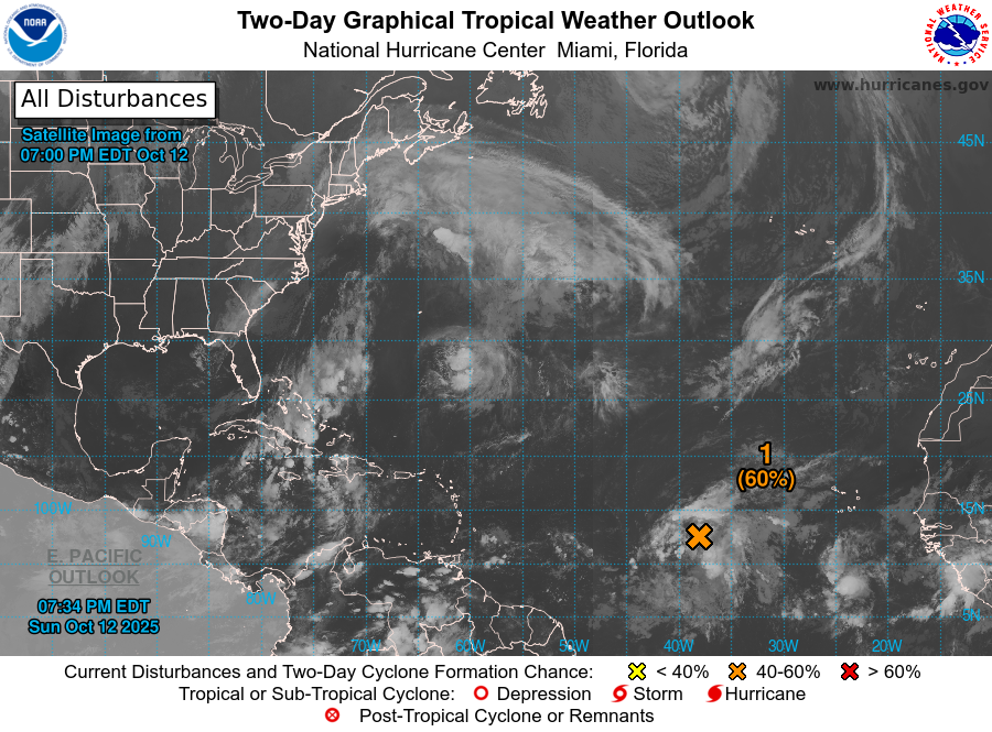 The latest Atlantic tropical outlook shows that Investigation 97 is currently present in the east-central Atlantic with a 60 percent chance of developing in the next two days and a 70% of developing in the next week. The models are all showing that is expected to shortly start curving to the north so it will not affect us in the US at all. The 2-day map shows the non-tropical remains of Jerry between 25 and 30 North and just east of longitude 60. You can barely see the coastal low near the Carolinas in the image but it is there causing heavy rain, windy conditions, and severe beach erosion along the coast. It will be moving to the NE and out of our region soon. The image also shows another tropical wave coming off Africa in the next few days, so that is something we will have to watch, although in October most of the African waves divert to the north and do not affect the US. But the season is not done yet so we keep watching.