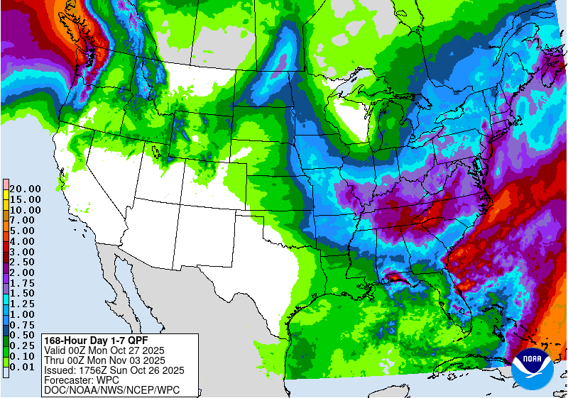 As I write this on Sunday afternoon, rain has moved through Alabama and is currently moving through northwestern Georgia. By the time I get my blueberry muffins out of the oven (in just a few minutes), the rain should be ready to start falling in Athens. Other regions in the Southeast will also see more than one round of rain this week. Most of the region will see at least an inch of rain, which is desperately needed, although may be coming too late for some and may not be good for harvest conditions for others. The driest part of the region will be southwest Georgia and western Florida other than the far western Panhandle near Mobile. Rain will fall in Georgia all day on Monday and will move off to the northeast. A second round of rain will occur on Tuesday night into Wednesday in northern Alabama and NW Georgia and then will also move off to the east. Rain amounts later in the week will be lighter, especially as the end of the week approaches. Temperatures will also be much colder in most of the region. This will give you a chance to bring out your fall and winter sweaters and start thinking about the holidays. After this rainy week, weeks 2-4 look like they will go back to drier than normal conditions for the first half of November, but cool conditions are expected to remain for at least week 2.