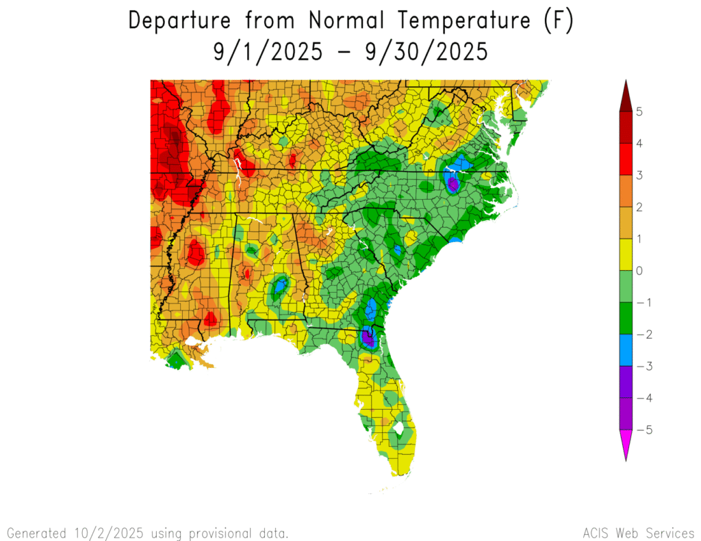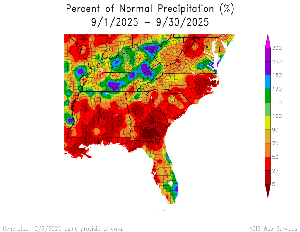 The latest monthly summary shows that while temperatures in the region were mostly cooler than normal, the lack of precipitation was quite noticeable in most of the region. I was surprised by how cool it was in some places, particularly because there was not a lot of rain and associated clouds to keep the temperatures below normal, but more air moved into the region from the north than often happens in September. Rainfall amounts were very low in many parts of the region. I don’t think the precipitation departure map really shows how bad it was, so I am showing the percent of normal rain in the map below. The majority of the region received less than 50% of normal rainfall, and there were some large areas that received less than 5% of the normal rain, including a large part of south central Georgia. Since September is often one of the drier months, that was especially distressing for farmers who were trying to finish their crops. No wonder the drought expanded so much this month!