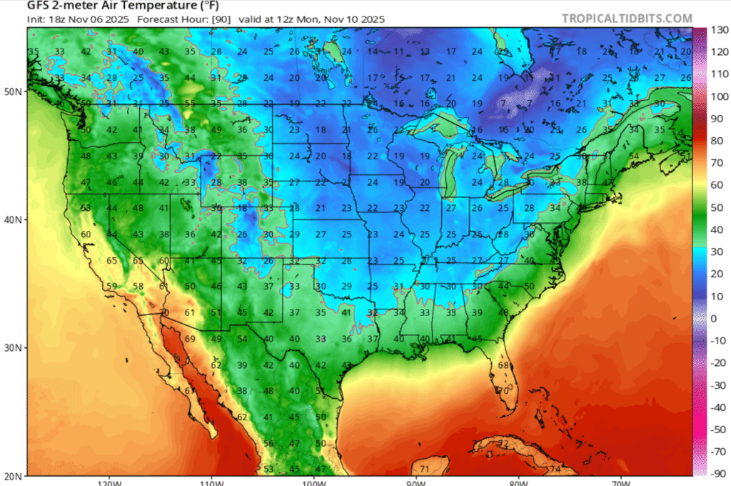 A blast of very cold air will be entering the Southeast beginning on Sunday and will bring freezing temperatures to a lot of the region. On Monday morning, the freezing temperatures will cover northern Alabama, all of Tennessee, and higher elevations of Georgia, the Carolinas, and Virginia. Temperatures will warm up during the day somewhat, but by Tuesday morning the cold temperatures will reach down to cover almost all of Alabama and Virginia and will surge to the Fall Line and beyond in Georgia as well as in the Carolinas. There may also be some patchy freezing temperatures in south central Georgia as well as in northern Florida on Tuesday morning. This outbreak is rare and deep, and some of my climatologist friends tell me this is a 3 to 5 sigma event (that’s standard deviations from normal), which means it is rarer than 1% occurrence. The AgroClimate map below shows that this occurs in fewer than one out of ten years in southern parts of the region (from http://agroclimate.org/tools/freeze-risk-probabilities/). There will be no freezing weather in southern Florida or in Puerto Rico, though.