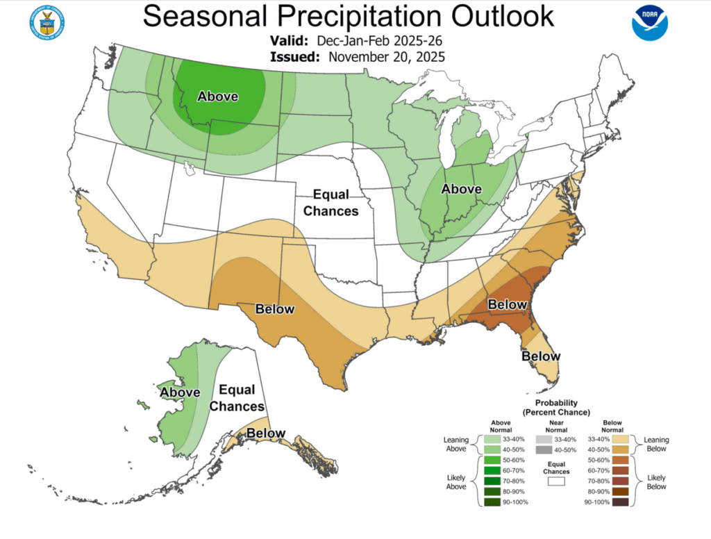 Pam also mentioned that the latest monthly and seasonal outlooks for winter 2025-2026 were released today (November 20, 2025). They show the continued classical pattern for a weak La Nina, not surprising since we are in that now and it is expected to last for the next few months. Unfortunately, the dry conditions in southern Al and GA as well as the Florida Panhandle make it likely that the drought there may get even worse in the next few months. This is a concern for farmers who need rainfall over the winter as well as those hoping to get an early start planting next season, since there is a good chance that dry conditions may affect seed germination.