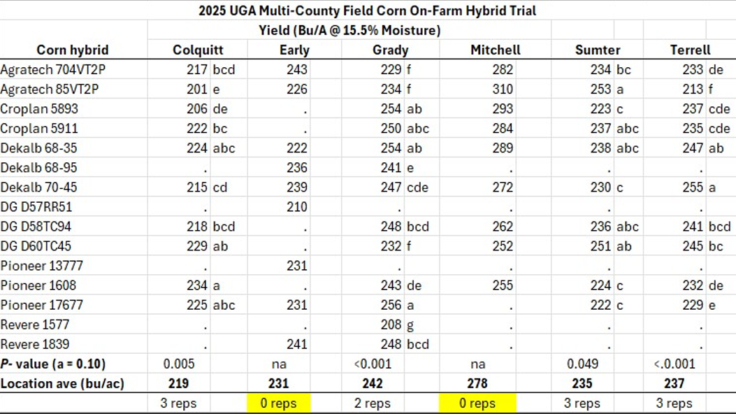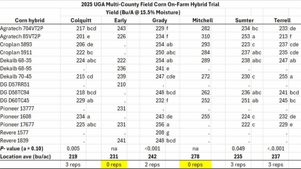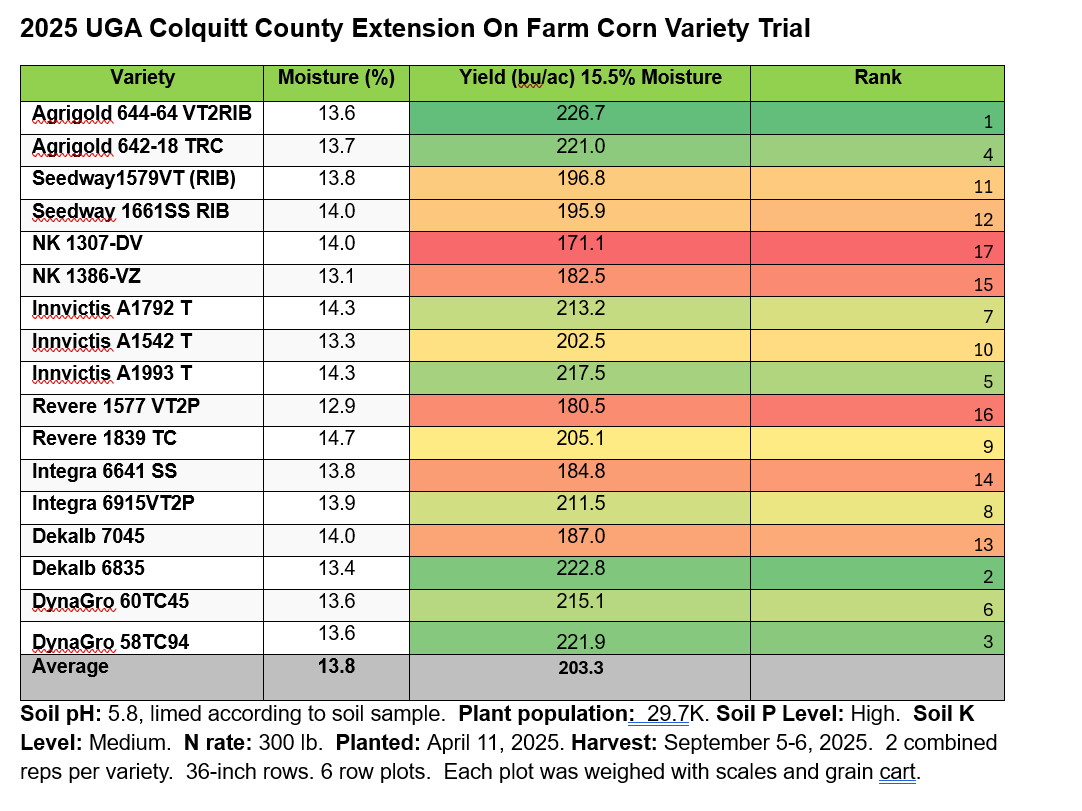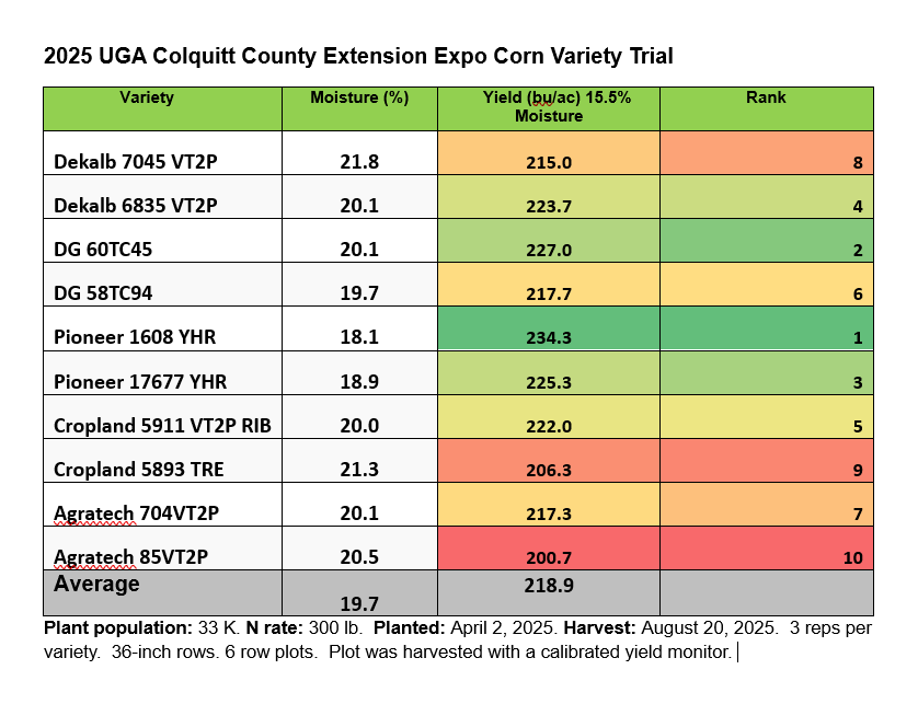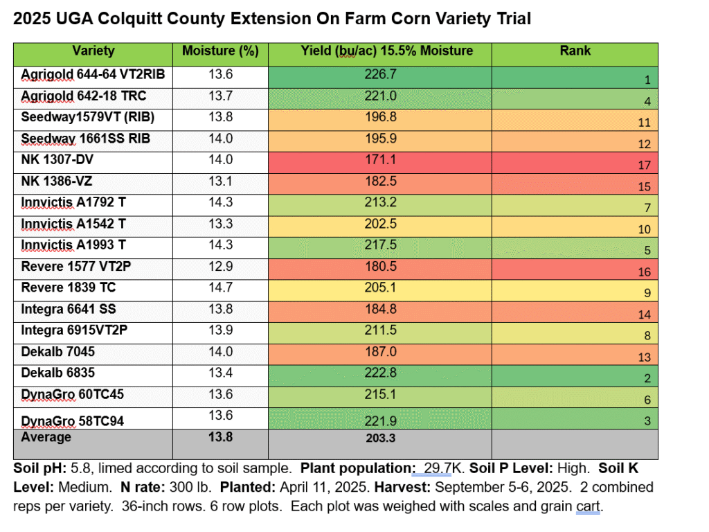 We had the opportunity to evaluate 17 varieties from AgriGold, Dekalb, DynaGro, Innvictis, Integra, Revere, NK, and Seedway at a second irrigated location in Colquitt County. The results are in the table below. I would like to thank all industry and growers who helped to make this project possible.