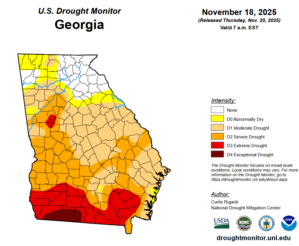 Harvest is coming to end and the dry weather continues across the state. According to the drought monitor, 100% of Colquitt County is suffering from D3 or extreme drought conditions. Local CocoRahs data suggests that the Colquitt County area has received 23% of normal rainfall as of today (November 25, 2025). According to Pam Knox, UGA , “The worst-hit areas of the region are in southwestern Georgia and the Florida Panhandle, where a D4 Exceptional Drought has now been designated due to their continuing lack of precipitation. Drought has also reappeared in southern Florida. The current La Nina is likely to make conditions there worse over the winter because La Nina winters are often warmer and drier than average, although there could be some temporary improvements.”