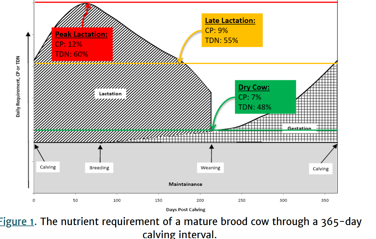 I need more protein to go with my hay. Is this correct? Possibly, however, protein is only half of the equation. From April 1 to October 1 of this year, 773 bermudagrass hay samples were submitted to the UGA lab. The mean crude protein and energy (TDN) value was 11.1%. and 55.7%, respectively. Figure 1 represents the CP and TDN requirements of a brood cow throughout the production year. As you can see, as cows are entering the final trimester, their CP requirement is exceeded by the average bermudagrass sample, but the energy requirement falls short. More importantly, as they calve, enter peak lactation, and the breeding season, the CP requirement is met, but the TDN falls tremendously short.