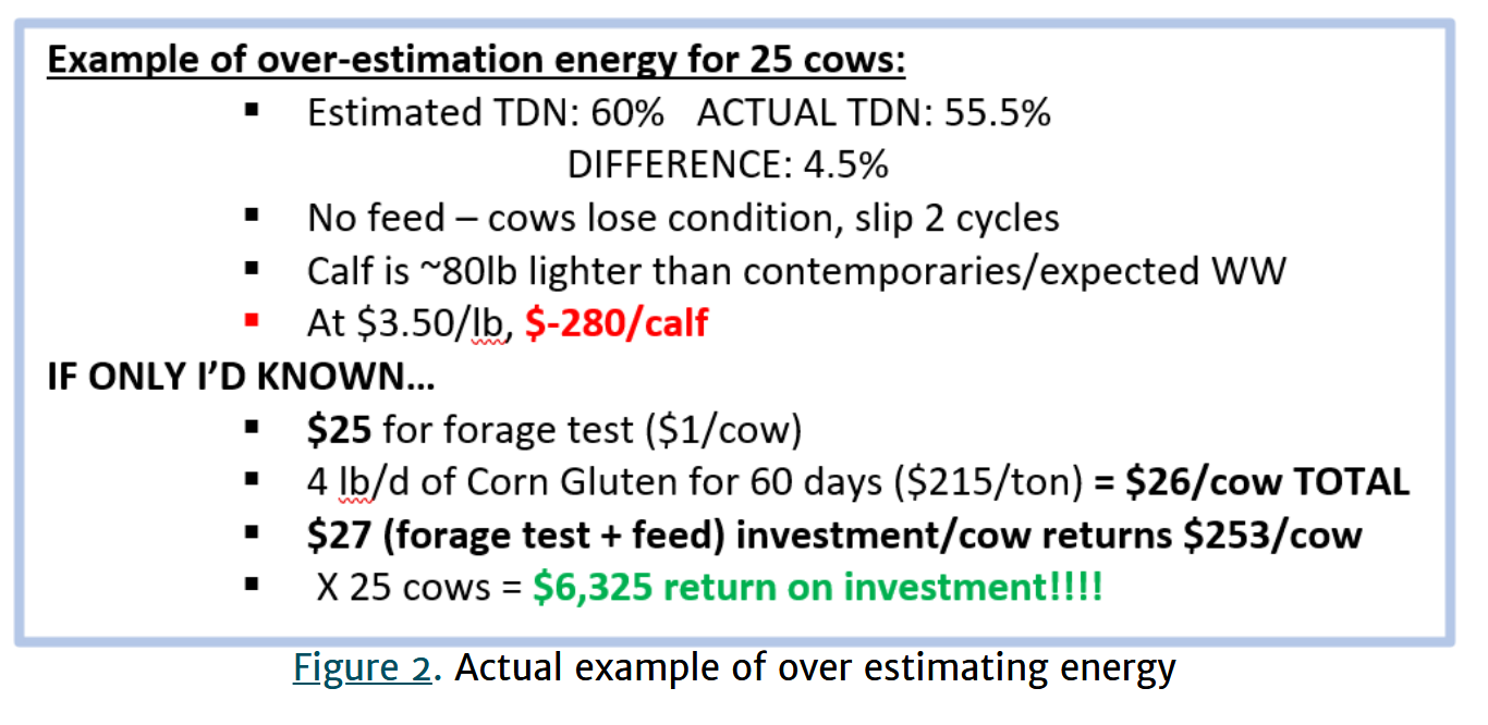 participants along with a survey to estimate what producers thought the quality of the hay was (prior to testing). This allowed for a comparison of what producers thought they An Equal Opportunity, Affirmative Action, Veteran, Disability Institutionhad versus what they actually had. This survey resulted in 83% of producer underestimating the protein of their hay compared to the actual. This would result in purchasing a protein supplement when not needed. For energy, 50% overestimated energy. This would result in depriving needed energy during late gestation and early lactation. In addition to the previously discussed fetal programming issues, this could also cause delayed breeding. An actual example of overestimation of energy is illustrated in Figure 2. The overestimation could likely result in breeding being delayed 42 days. The resulting loss in weaning weight could easily reach 80 lb, resulting in an approximate $280 decrease in value per calf. Through forage testing, the producer would know to feed 4 lb/d of a supplement such as corn gluten feed. Based on a 25-cow herd, this could easily return $6,325 above cost. That is a no-brainer!