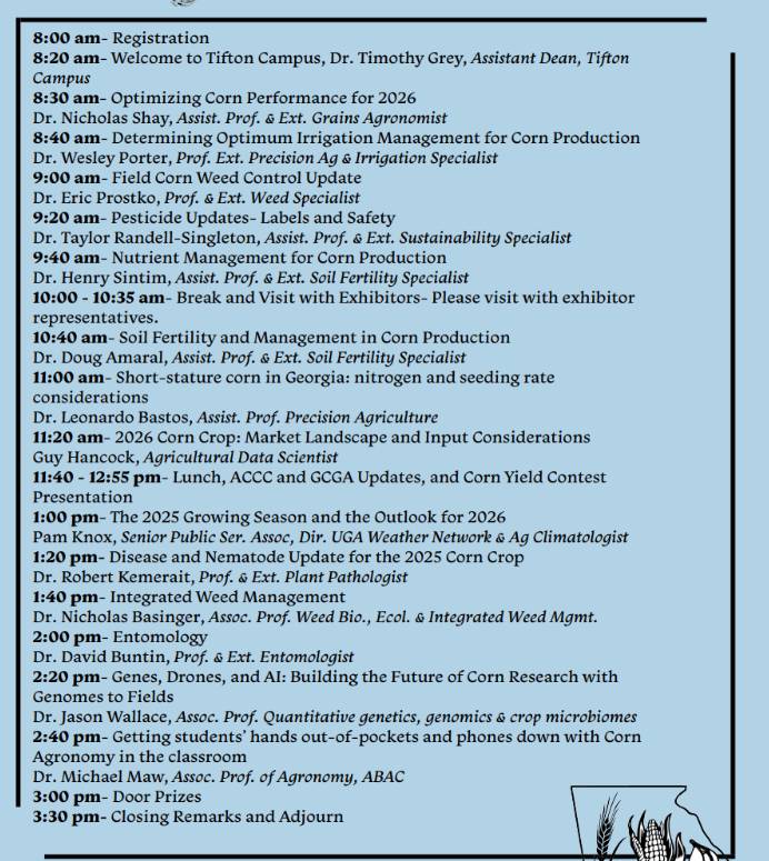 The 2026 UGA Corn Short Course is planned for January 20, 2026. This meeting will be held at the UGA Conference Center in Tifton, GA.