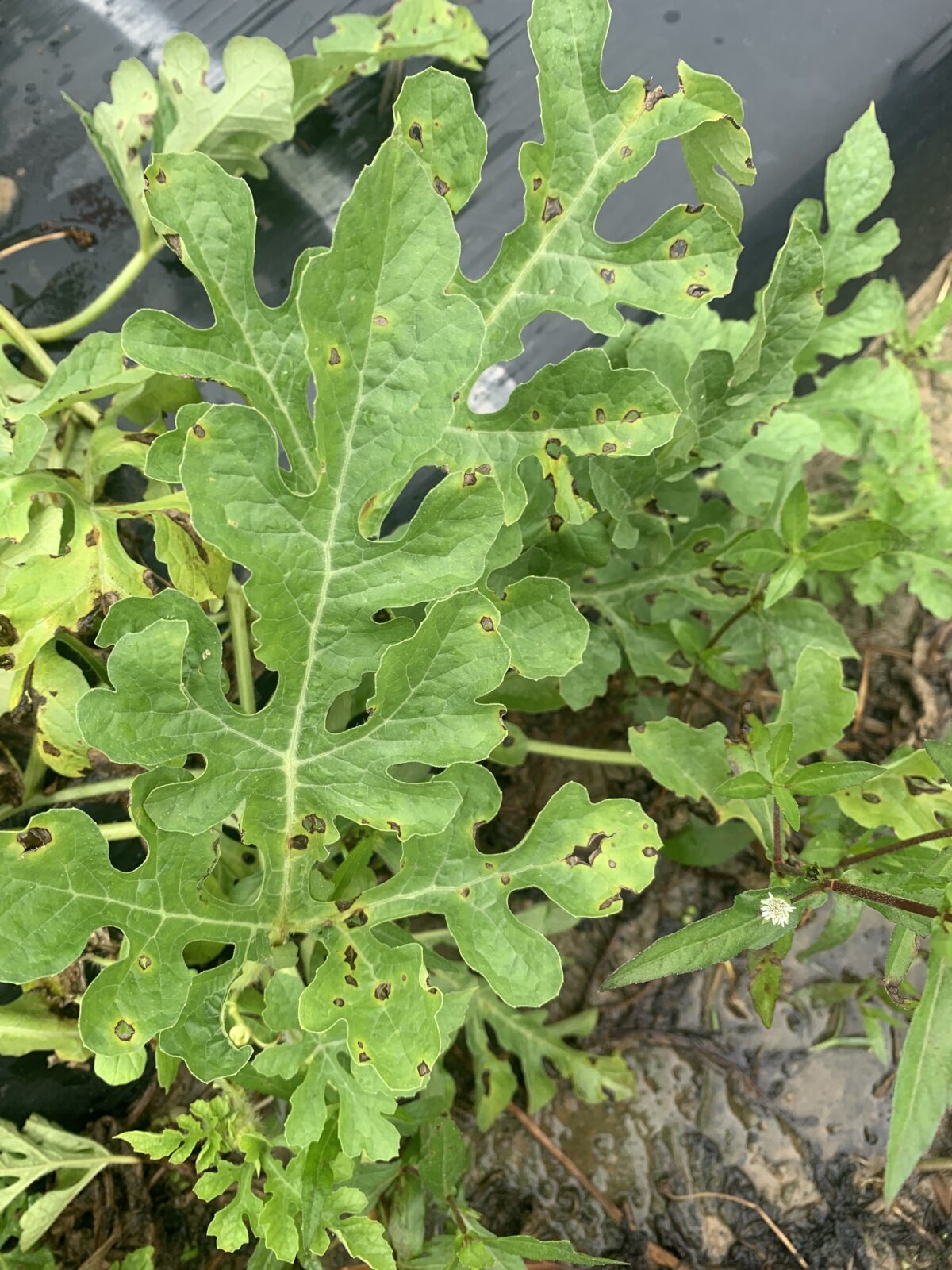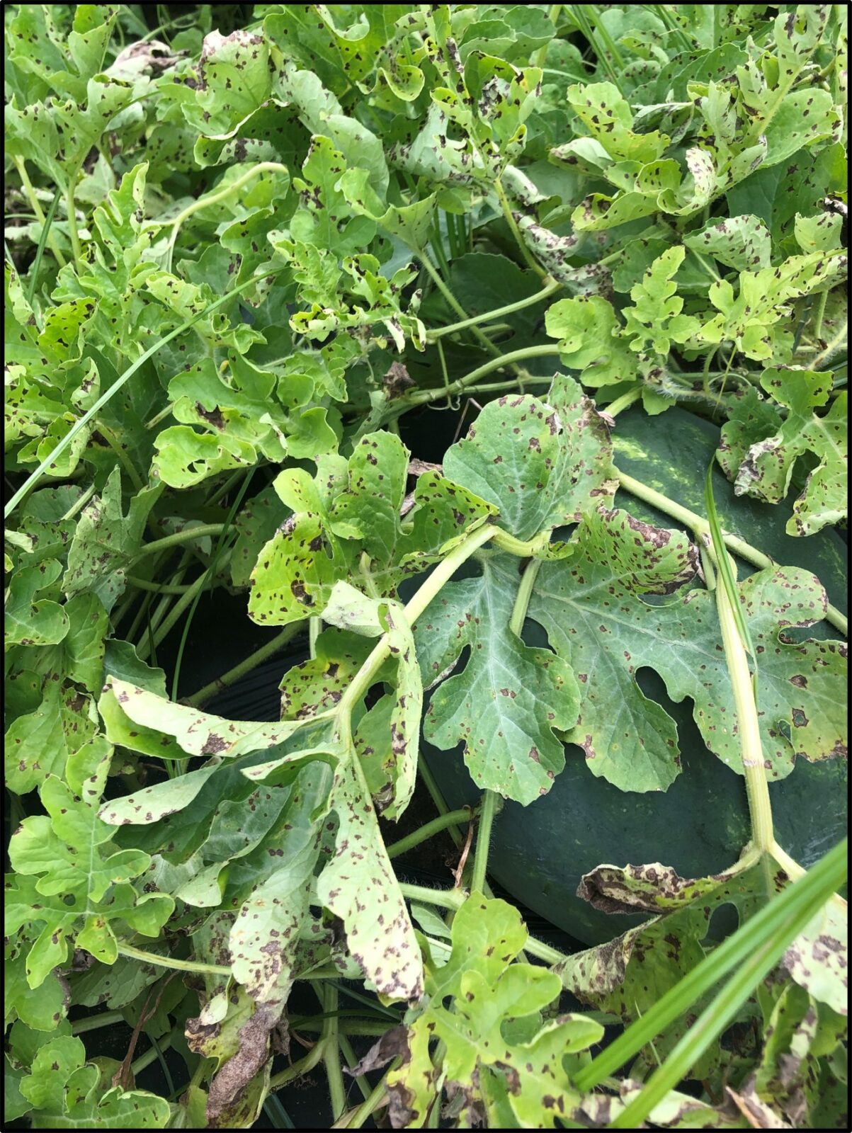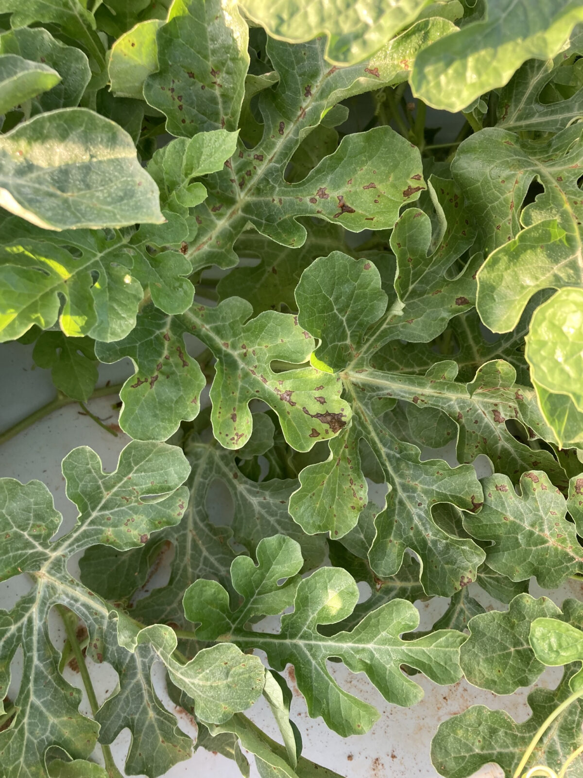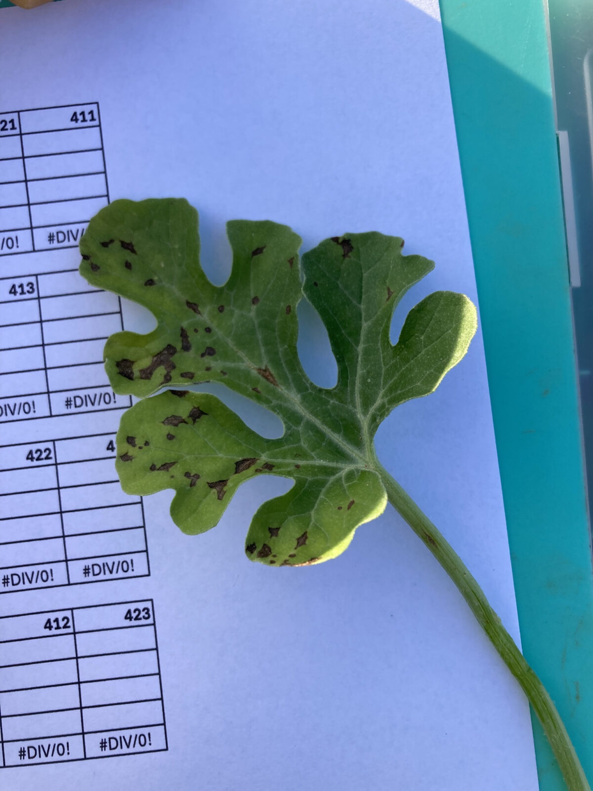 Watermelon Fruit Load Trial: Anthracnose symptoms on leaves (Dr. Coolong Lab, UGA 2025)