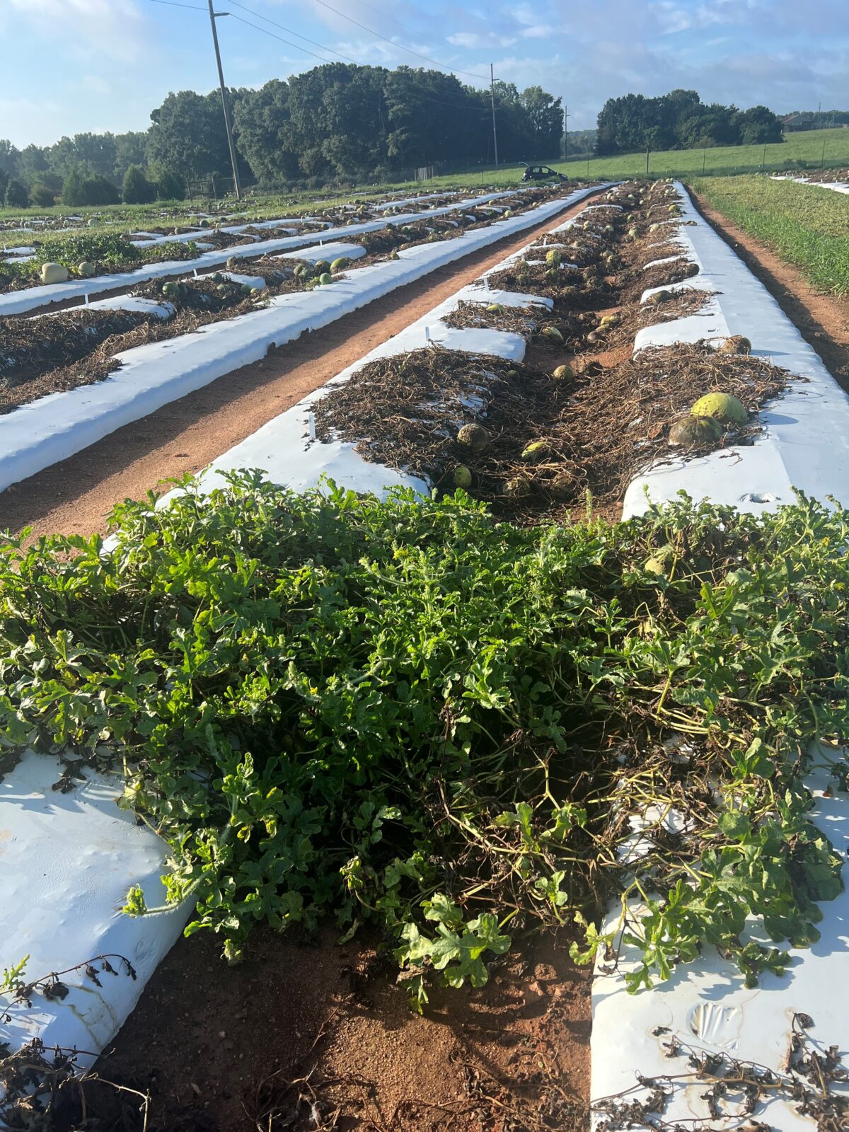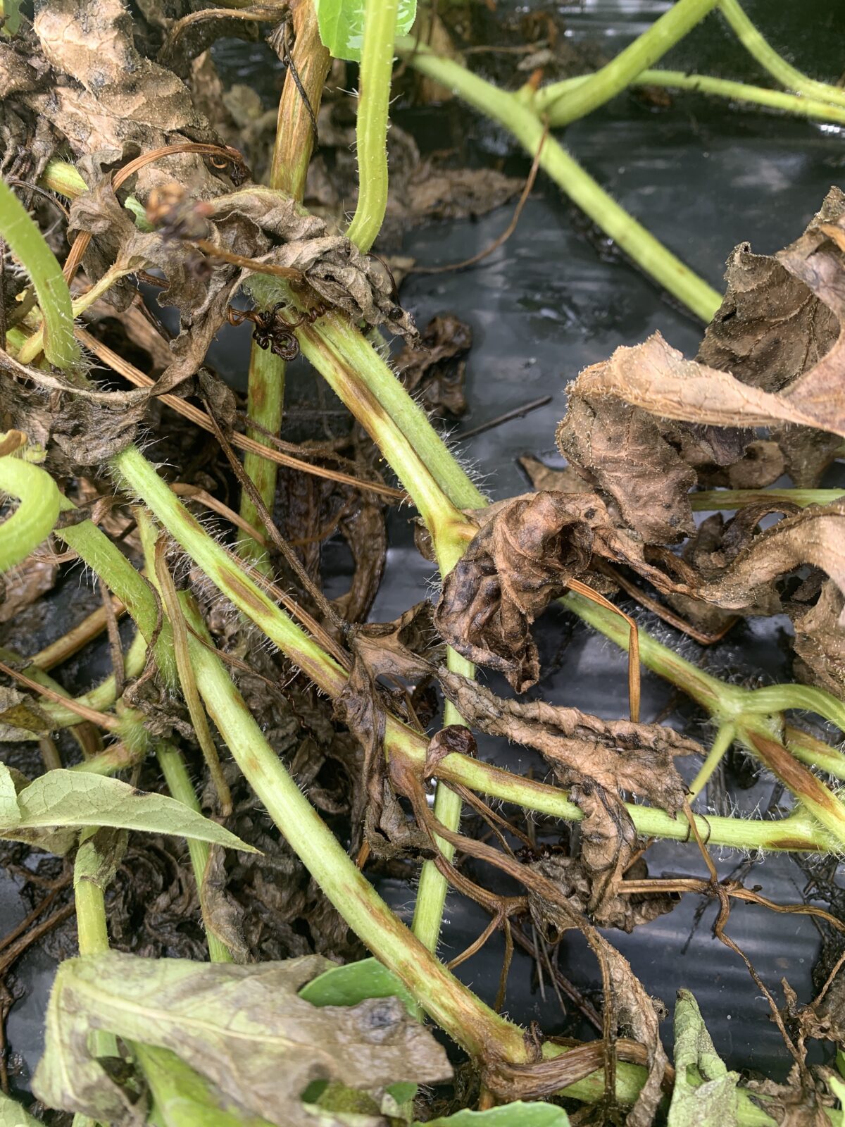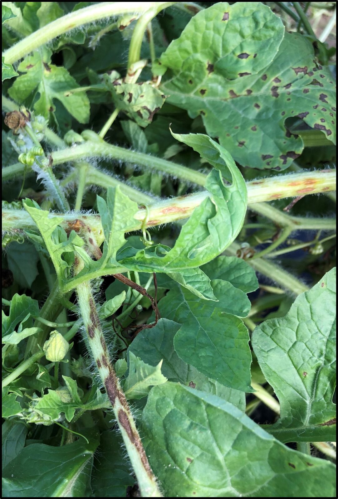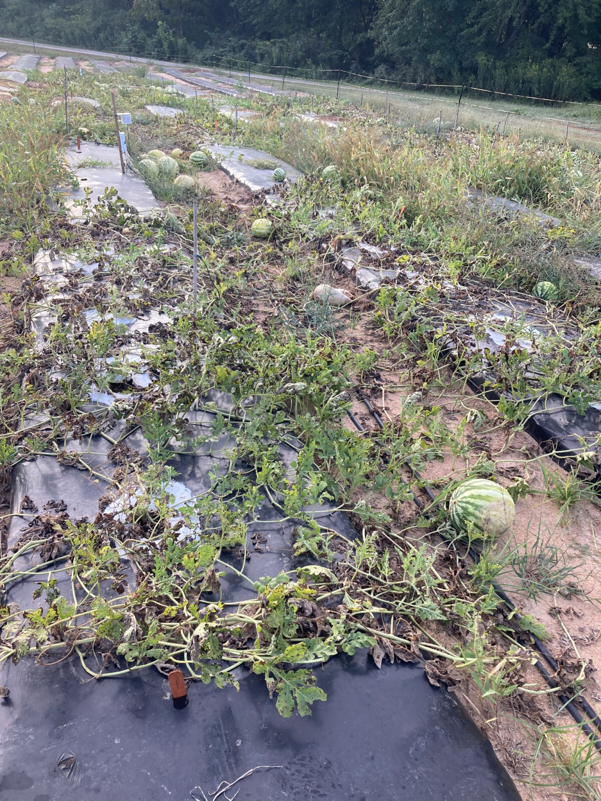 Watermelon Irrigation trial: Severe anthracnose symptoms on entire plot at end of season (Dr. Coolong Lab, UGA 2024)
