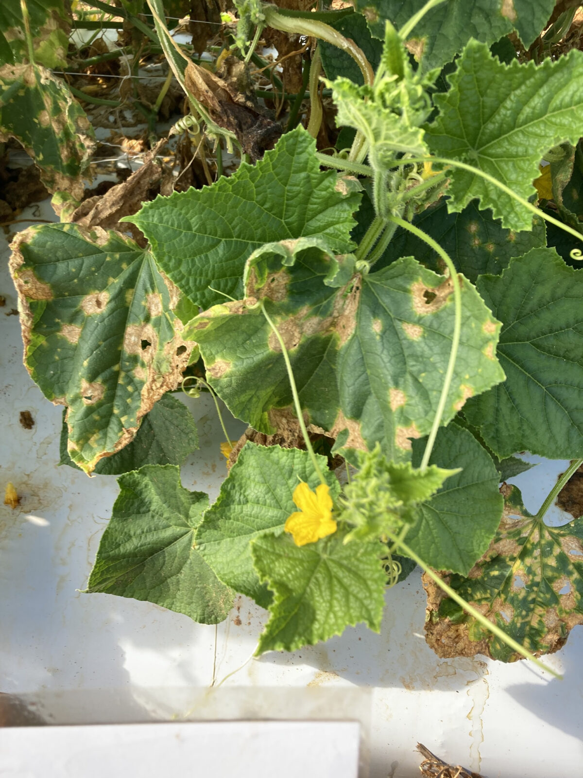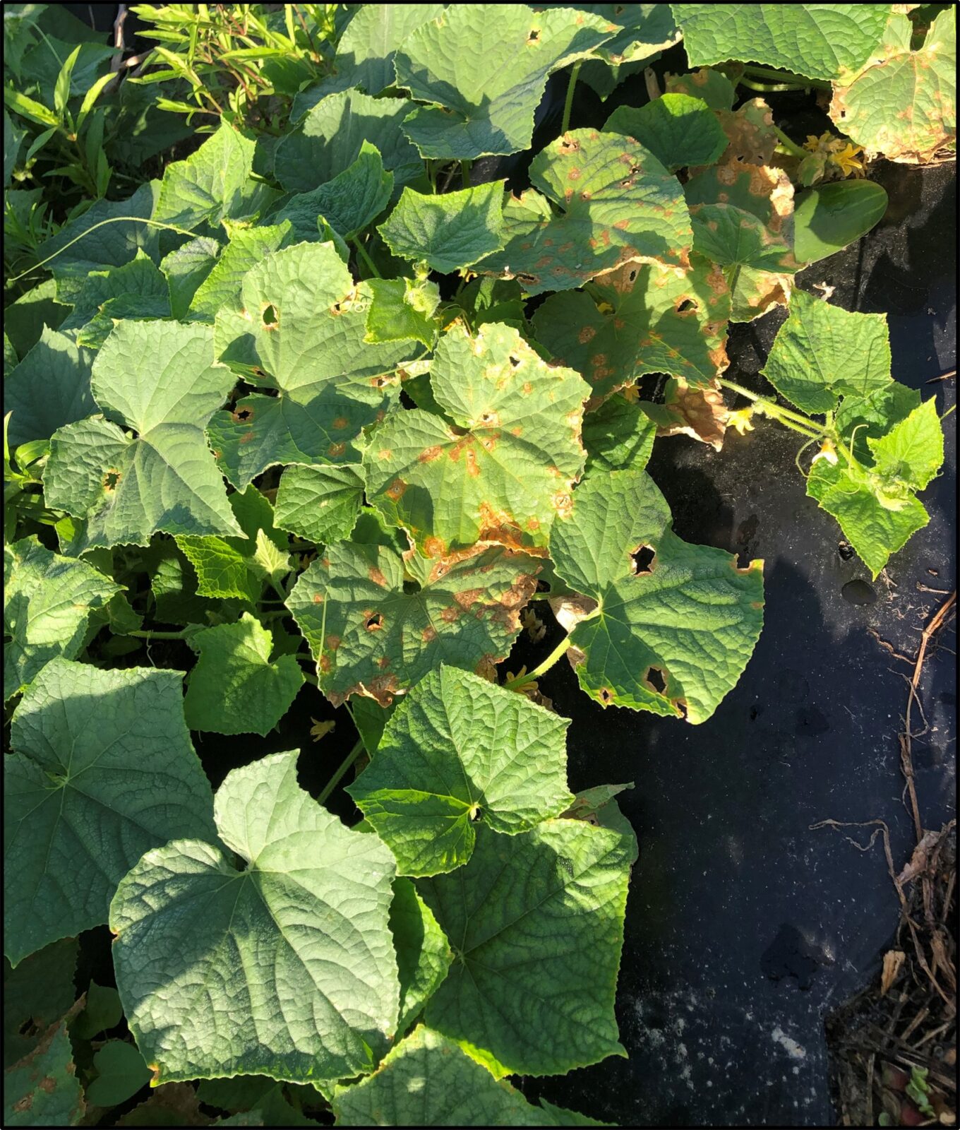 Symptoms on leaves appear yellowish to dark brown in color that often turn necrotic on cucumbers leaf (Tift County, Georgia, 2025 )