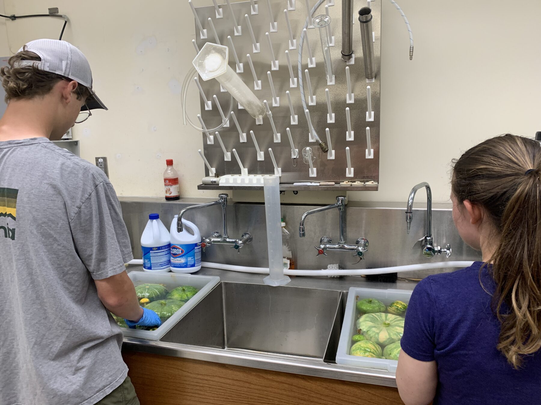 Summer interns disinfesting pumpkin fruit before it is challenged with the Colletotrichum fungus to find out which fruit ages are susceptible to anthracnose (Dr. Keinath’s lab, Clemson, 2025)