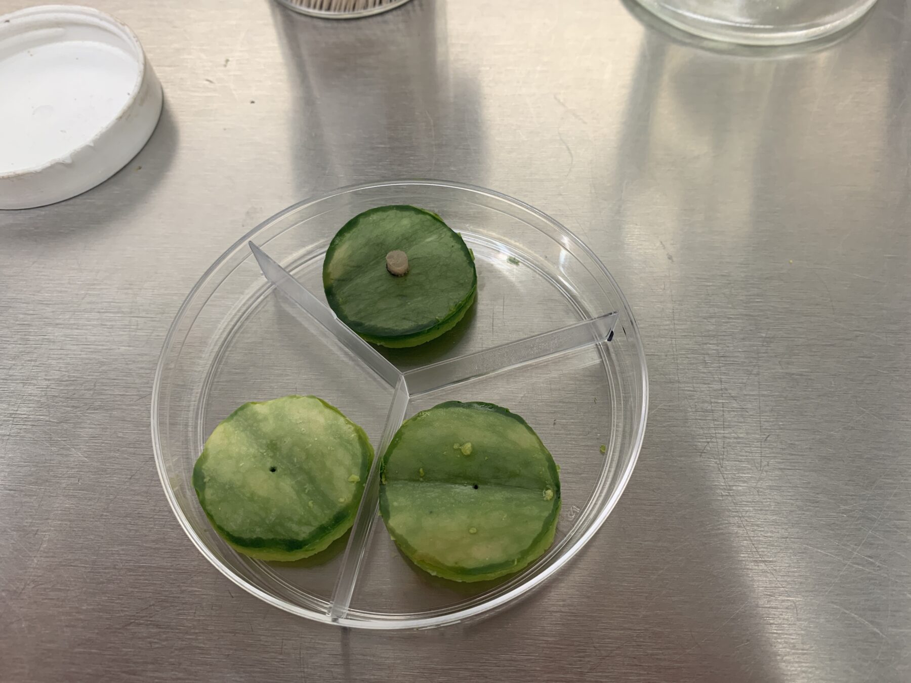 Fruit discs in a petri dish to test susceptibility of different aged fruit to anthracnose. The top disc has been inoculated with agar plug of Colletotrichum fungus while the two bottom discs were wounded by sterile toothpick before they are inoculated (Dr. Keinath’s Lab, Clemson, 2025)