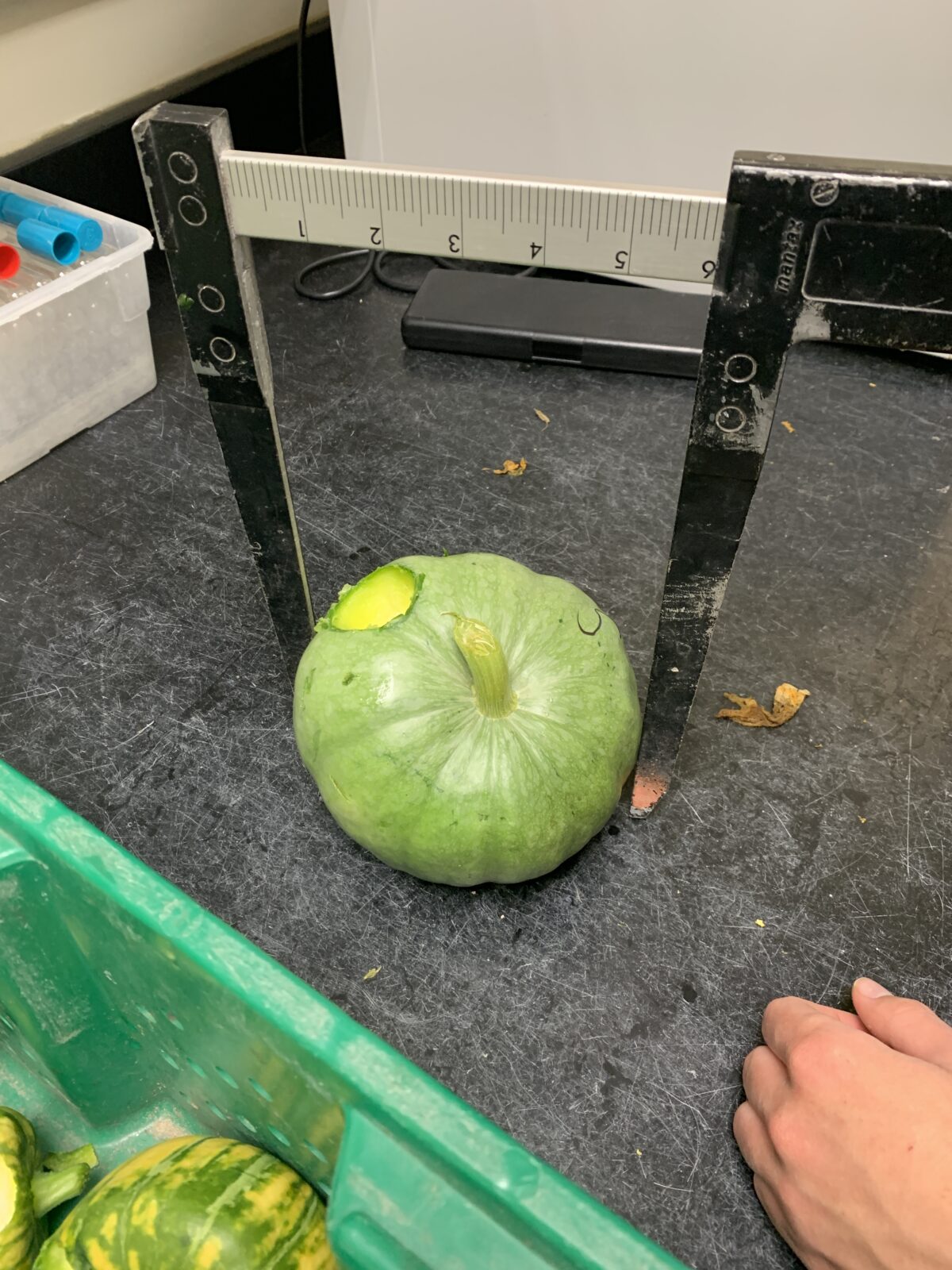 Measuring fruit with a caliper to record the size (Clemson,2025)