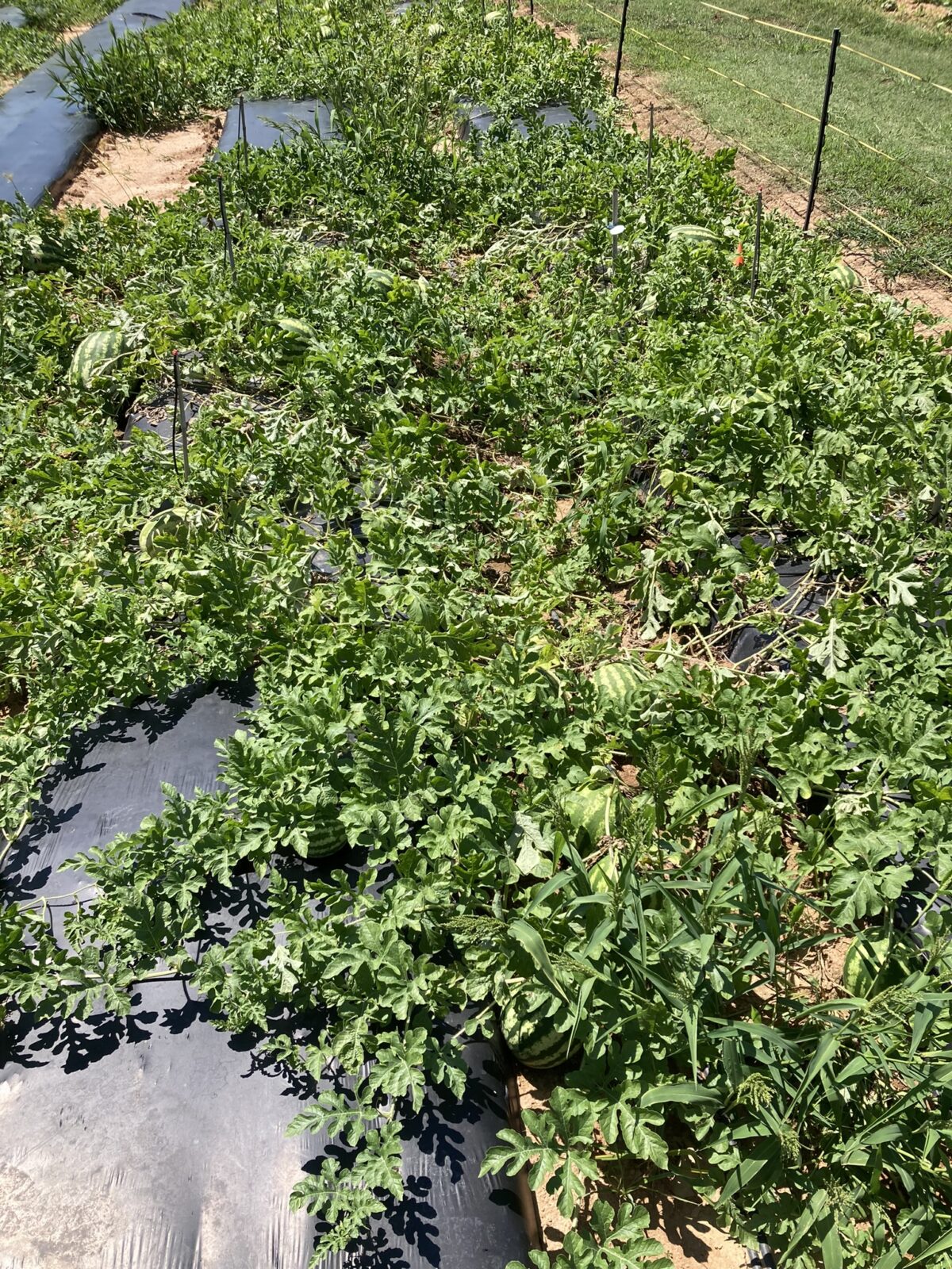 Resistant (green, healthy vines) versus susceptible (wilted, dead) watermelon genotypes at the end of the anthracnose Core Collection phenotyping trial (Dr. McGregor Lab, UGA 2025).
