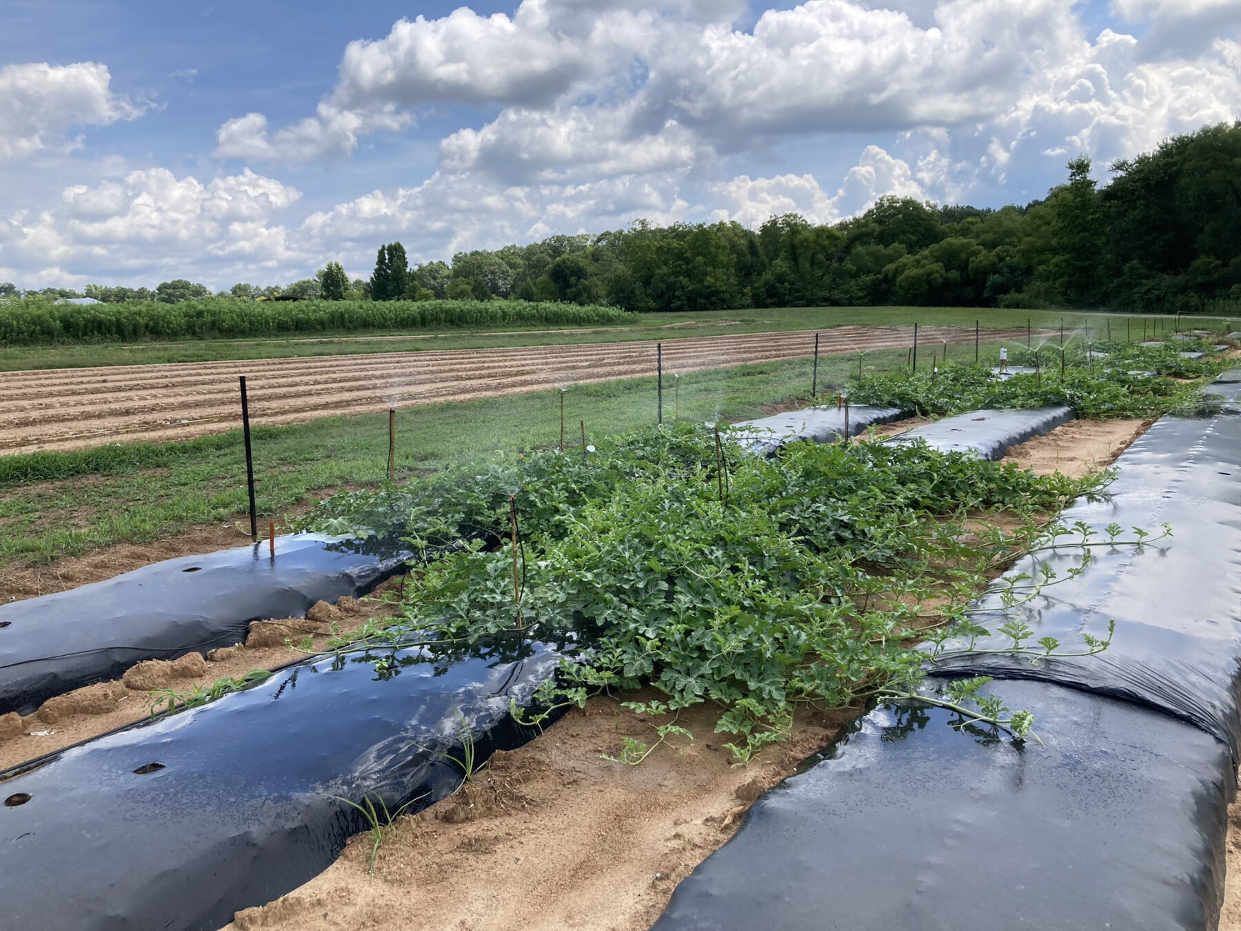 Watermelon Irrigation trial: Plot layout and what it looks like when misters are on, misters simulate overhead irrigation (Dr. Coolong Lab, UGA 2024)