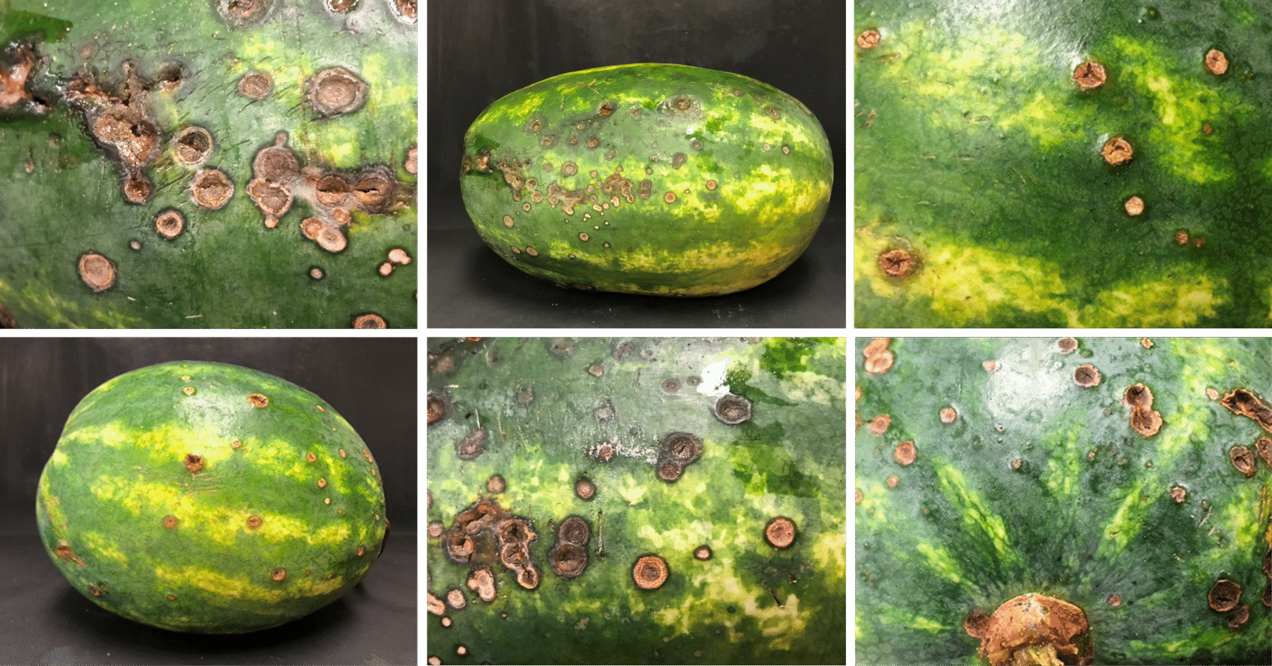 Sunken water-soaked lesions with orange or salmon colored spore mass on watermelon fruit (Dodge county, Georgia, 2025)