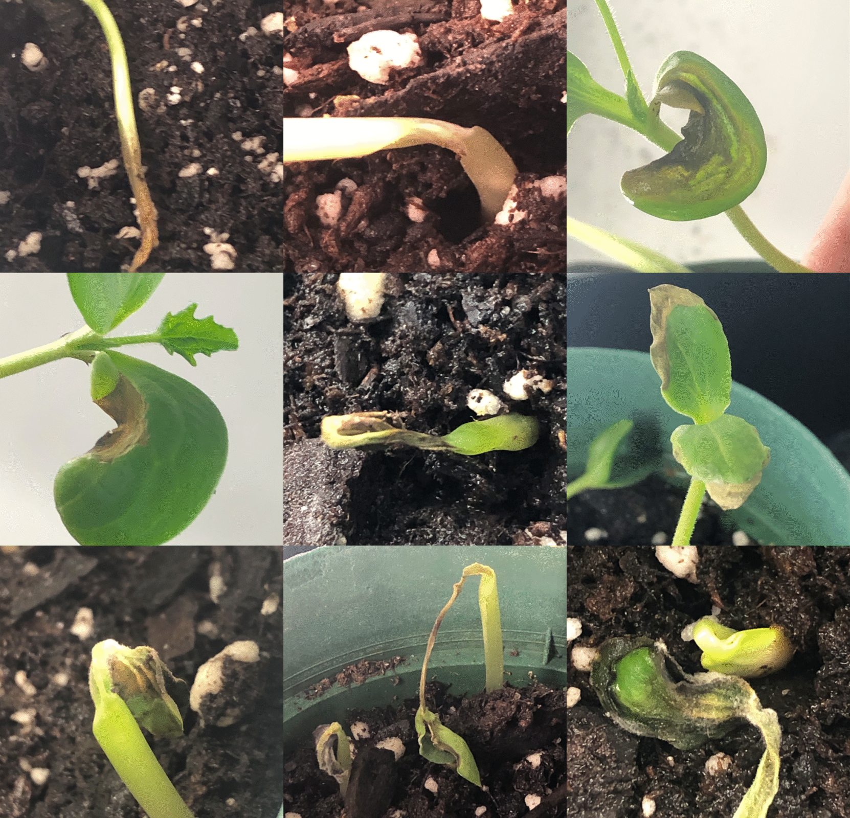 Symptoms of anthracnose in watermelon seedlings grown from vacuum-infiltrated seeds in a growth chamber (Dr. Walcott lab, GA, 2025)