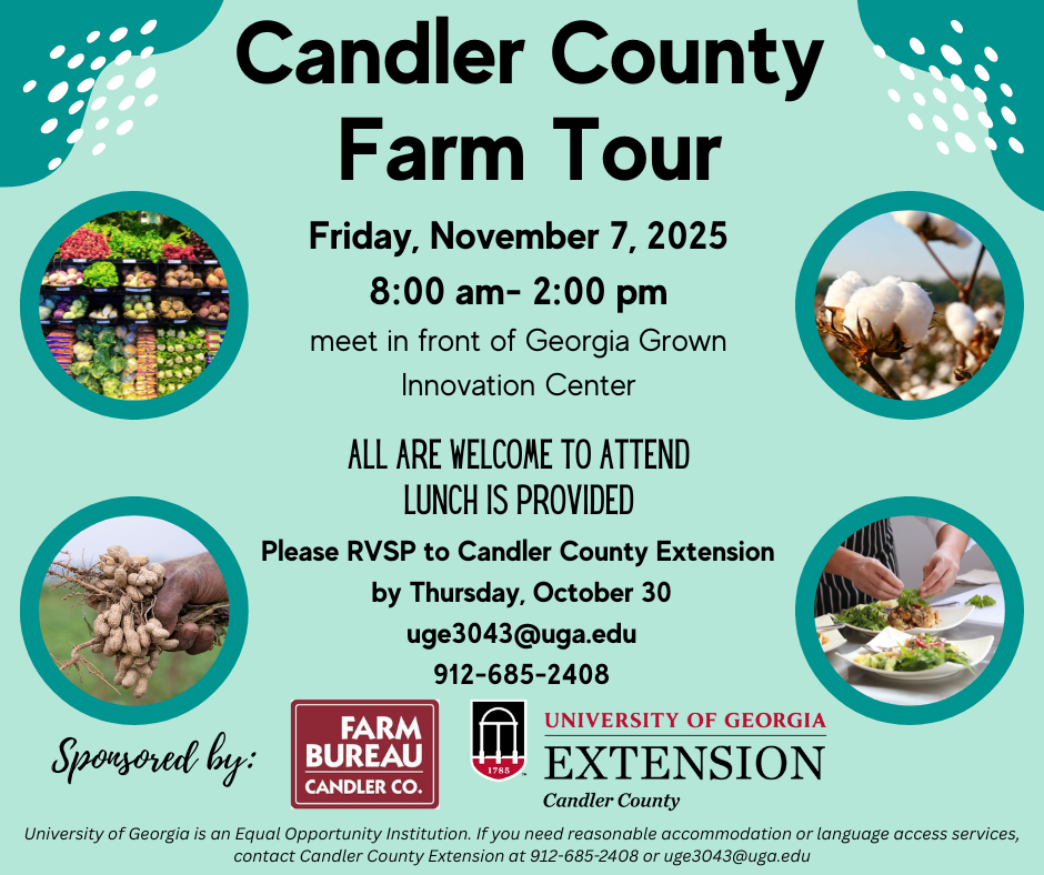 The Candler County Extension Office is excited to host the 2025 Candler County Farm Tour on Friday, November 7, 2025, from 8:00 a.m. to 2:00 p.m. Community members, educators, growers, agribusiness professionals, and anyone interested in learning more about agriculture in our area are invited to attend.