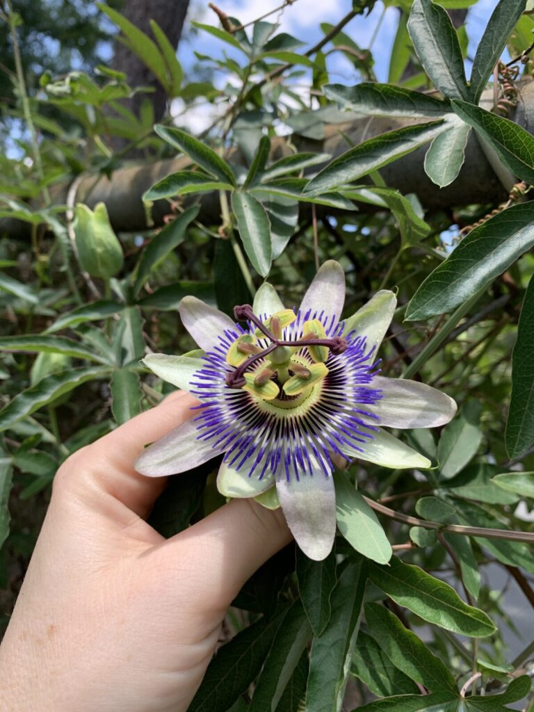 - Maypop/Passionflower (Passiflora incarnata): A perennial vine that dies back each year but regrows vigorously. It produces edible fruit and is the host plant for gulf fritillary butterflies.